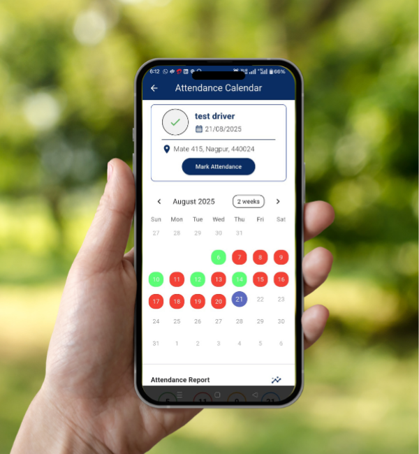 The Mark Attendance feature enables drivers to log their daily attendance directly through the FMS mobile application. This digital system replaces manual registers, ensuring accurate and real-time attendance tracking.